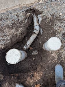 陥没箇所を掘ってみると、排水管が出てきましたが継手からパイプが外れていて排水の汚水が地中にしみ込んで流れていなく、汚水マスの水が溜まるトラップ部分に土砂が入り込んで満杯になっていました。